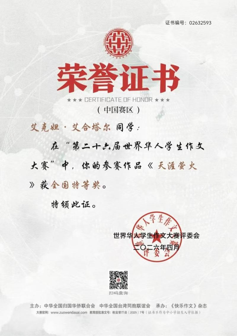 4月初,第二十六届世界华人学生作文大赛获奖名单揭晓,库尔勒市实验中学高一(7)班学生艾克妲·艾合塔尔凭借作文《天涯萤火》脱颖而出,荣获全国特等奖,展现出新时代青年学子扎实的文学素养与细腻的文字表达。