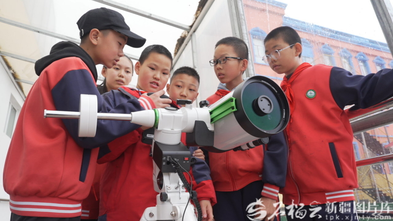 4月17日,专业人员指导吉木乃县直小学同学们调试天文望远镜,并进行观测。胡阿尼什·那斯哈提 摄