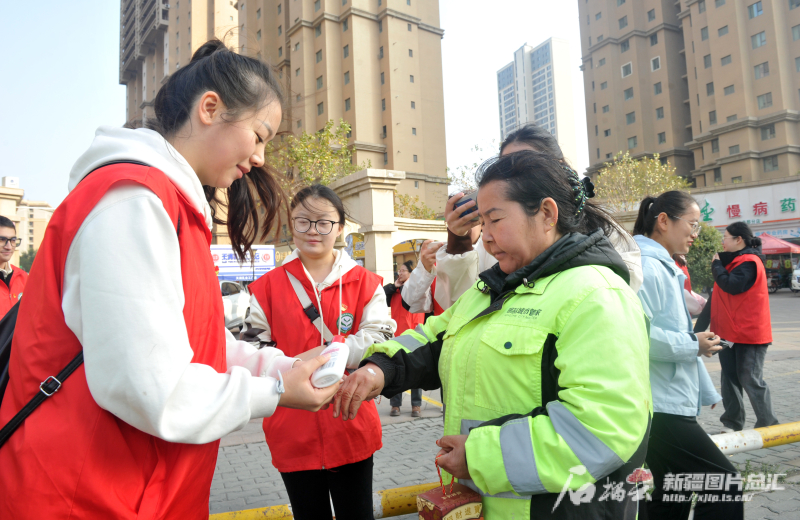 志愿者们为环卫工人擦拭护手霜(资料图)。石榴云/新疆日报记者 秦梅花摄
