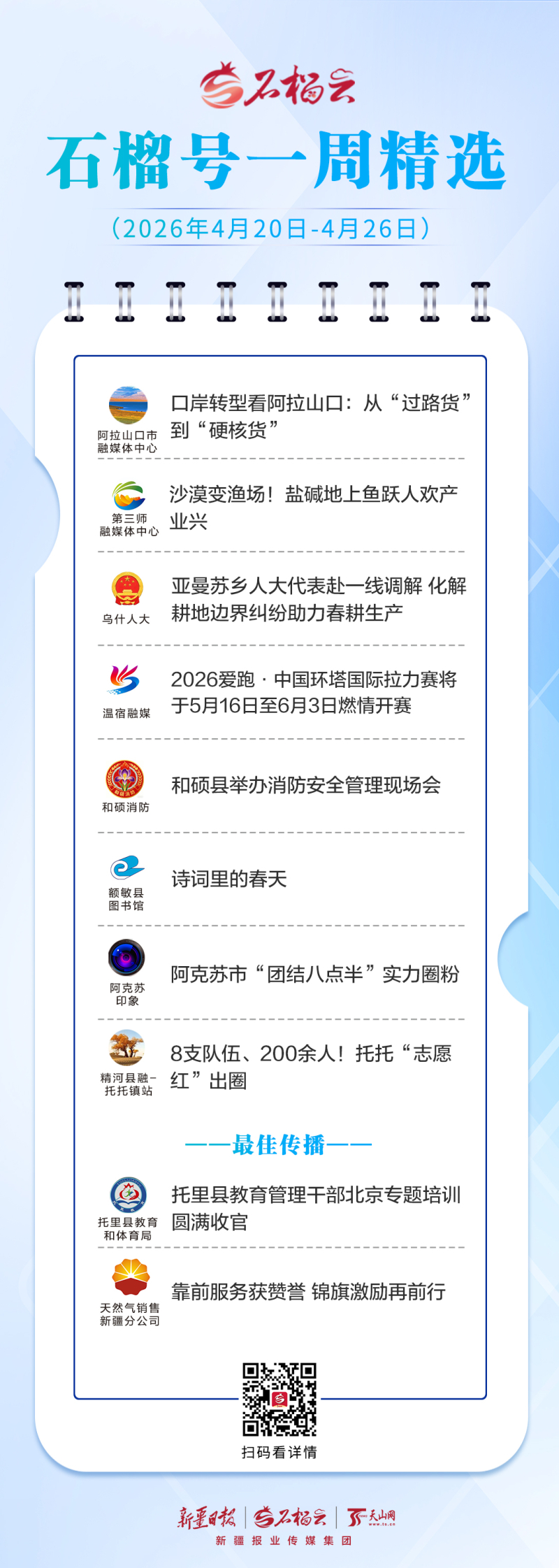 沙漠孕育水产发展之路,人大代表田间解纷,志愿力量温暖汇聚……一幅幅实干担当、创新突破的生动图景,书写着新疆高质量发展的生动实践。石榴云客户端精选4月20日-26日期间,“石榴号”上的精彩篇章,为您逐一呈现。