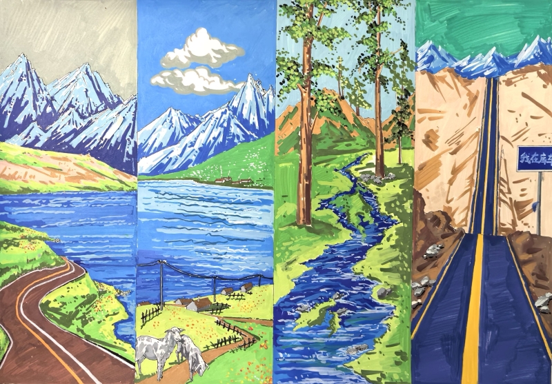 来自新疆库车的八年级男生阿卜杜拉·买买提,创作四联画作《山河入画》,铺展独库公路沿线风光:雪山巍峨、湖水澄澈,草原牧场上羊群闲步,溪流穿林而过,笔直公路向远方延伸。他用明快色彩展现新疆多样景致,向大家发出邀请:来新疆吧,亲身感受这片土地的辽阔与美好。