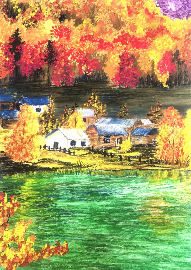 来自河北的九年级女孩周诗悦,从课本和短视频中认识了新疆喀纳斯、禾木等景区,对阿勒泰充满向往,创作了画作《阿勒泰秋歌》。画中,秋日山林被红橙金黄染得热烈,木屋静立河畔,碧绿湖水倒映着斑斓秋景,尽显她对远方的想象。她曾和父母去过我国最北端的北极村,如今中考在即,她满心期待着考试结束后,踏上新疆之旅,前往阿勒泰地区哈巴河县“西北第一村”白哈巴村,感受别样的风景与文化。“到时候,我一定要亲自体验新疆传统手工艺品的制作过程,留下一段特别的记忆。”周诗悦说。