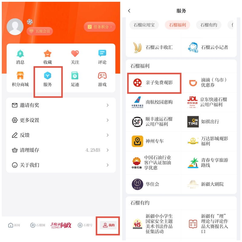 1. 打开石榴云App→点击“我的”→“服务”→“亲子免费观影”→填写报名信息+提交截图。