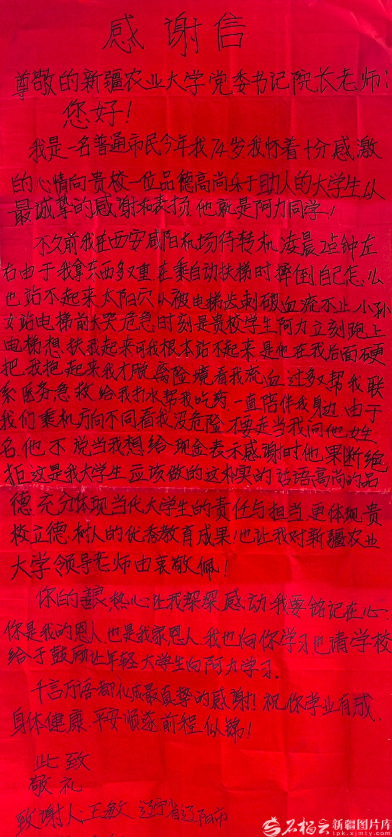 王敏老人写给新疆农业大学的信,讲述了自己危难之时,阿力木江·阿不都吾甫尔热心相助的事。新疆农业大学供图