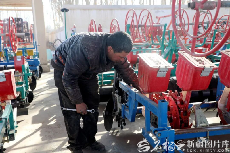 3月,莎车县拍克其乡农机管理服务站工作人员正在检修农机。莎车县融媒体中心供图