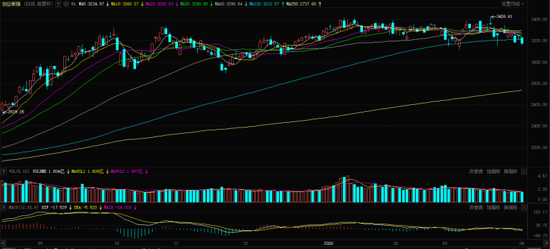 创业板指日K线图(来源:东方财富)。