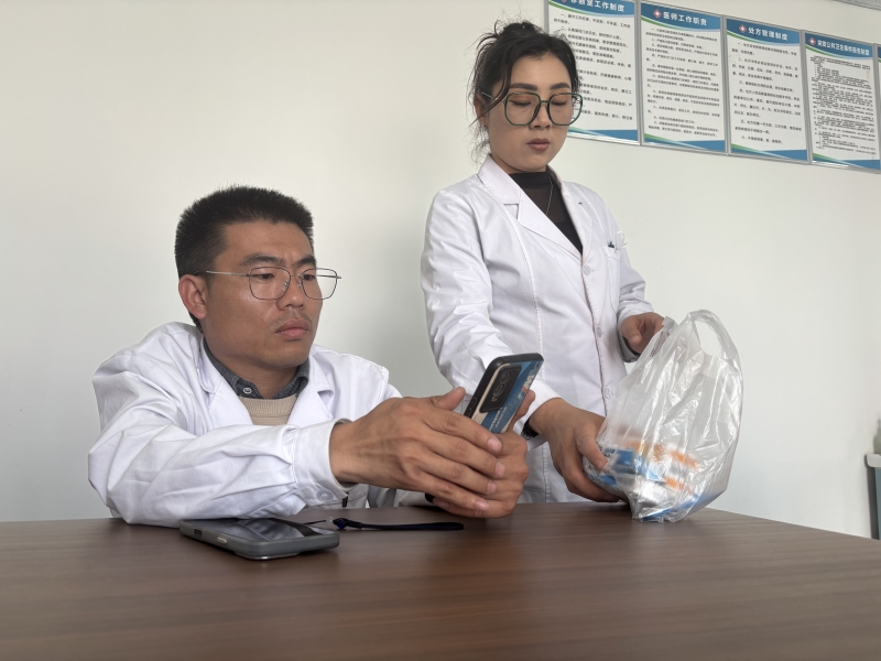 正说着话,一个父亲带着儿子推门进来,孩子上七年级,咳嗽,脸通红。李创业放下手里没吃完的馕,量体温,看喉咙,取药。价钱比药店低不少。