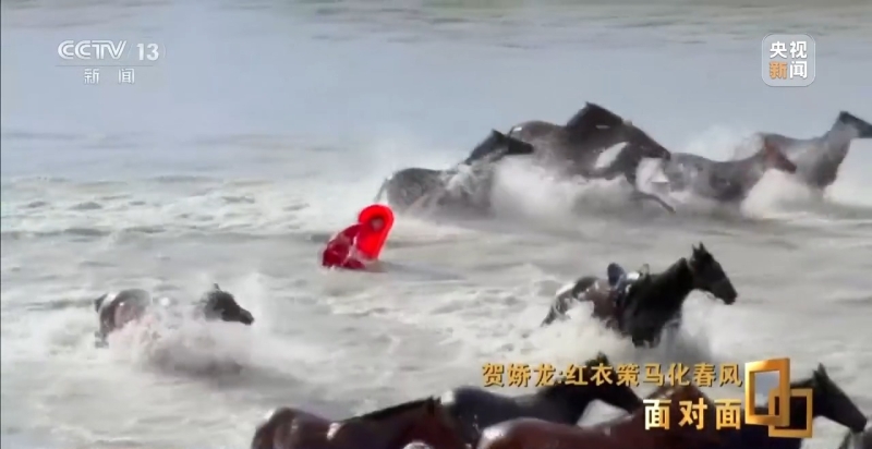海沙尔:她上来之后就抖一下衣服,把脸上的泥巴简单擦一下,然后就说换一匹马再来一次,我们就当场换了一匹马再来,她在那来回跑了好几趟,把这条视频拍完。