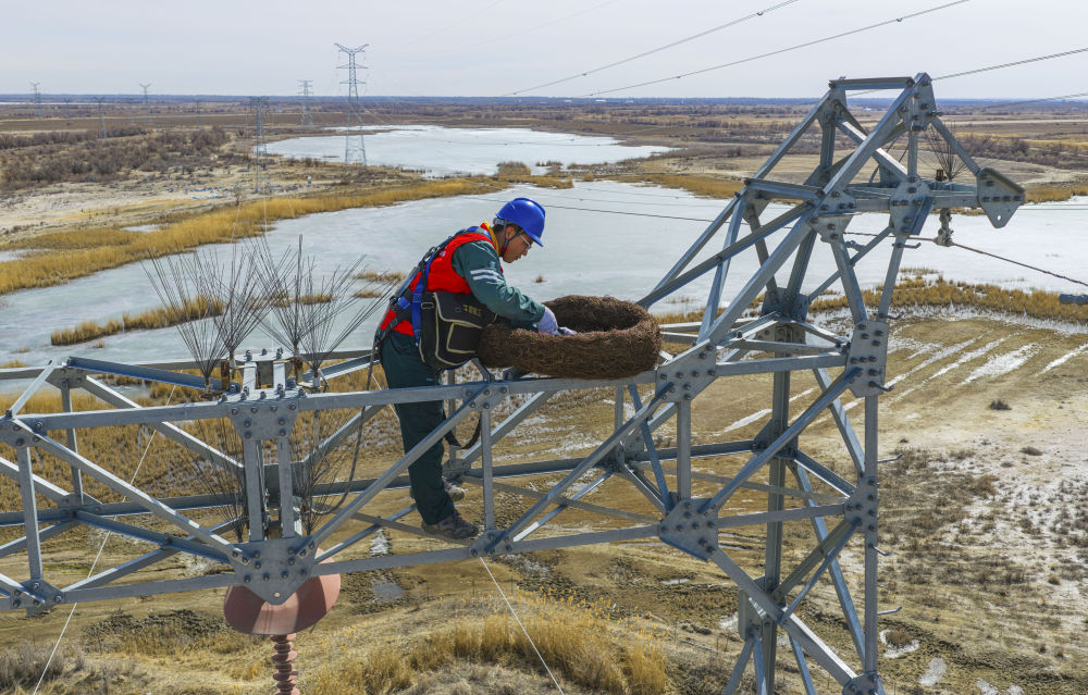在位于新疆阿勒泰福海县的乌伦古湖国家湿地公园,国网阿勒泰供电公司工作人员在固定生态鸟巢(4月1日摄,无人机照片)。 新华社发(努尔别克·努尔曼 摄)