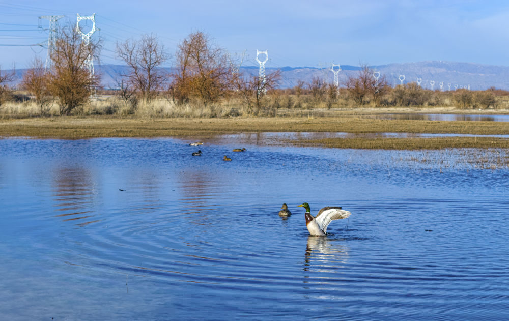 在位于新疆阿勒泰福海县的乌伦古湖国家湿地公园,候鸟在输电线路旁游水嬉戏(4月1日摄)。 新华社发(努尔别克·努尔曼 摄)
