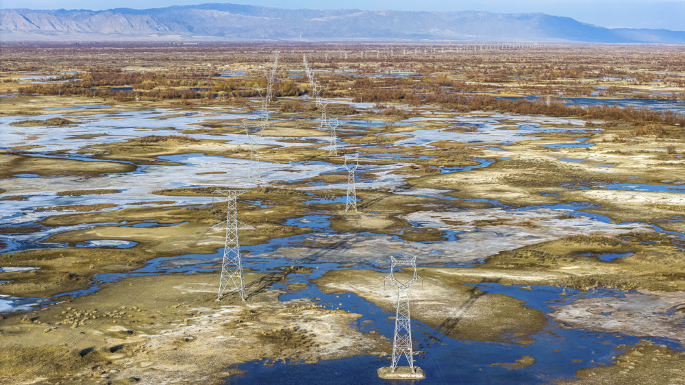 在位于新疆阿勒泰福海县的乌伦古湖国家湿地公园,高压线路横跨沼泽湿地(4月1日摄,无人机照片)。 新华社发(努尔别克·努尔曼 摄)