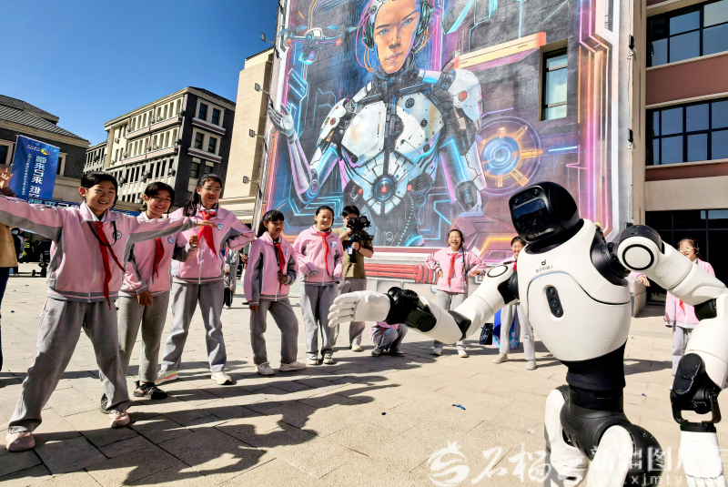 4月23日,学生们在少年立方高新研学基地·低空飞行馆与智元灵犀X2全智能双足人形机器人互动。当日,少年立方高新研学基地·低空飞行馆在乌鲁木齐高新技术产业开发区(新市区)安宁渠文旅小镇正式开业。 石榴云/新疆日报记者 李雄心摄