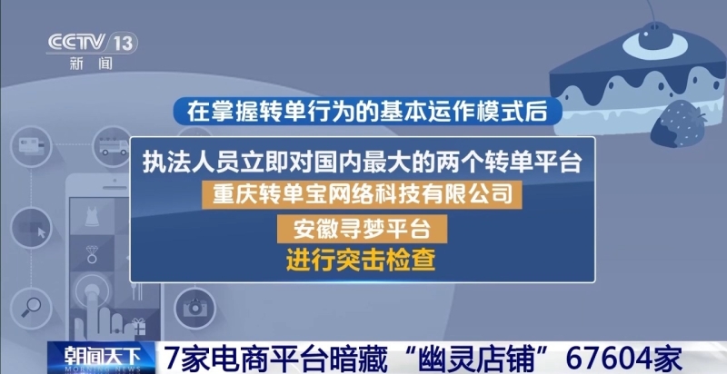 市场监管总局执法稽查局稽查四处处长 韩冰:“幽灵店铺”,大型电商平台,转单平台,最后由线下店铺接单,然后通过本地快递送给消费者,在这个利益链条中,我们认为转单平台是一个枢纽,于是我们就对国内大型的转单平台进行了现场检查。调取数据发现,全国有至少七家电商平台有这种转单的行为。