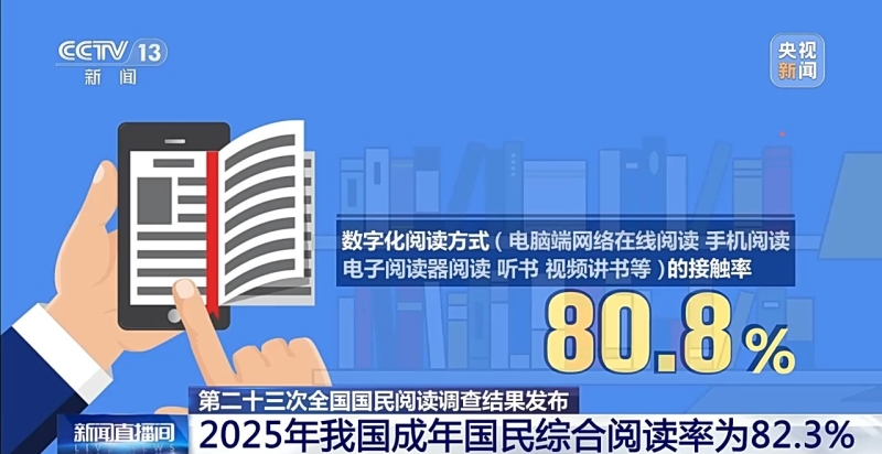 2025年我国成年国民包括书报刊和数字出版物在内的各种媒介的综合阅读率为82.3%,较2024年的82.1%提升了0.2个百分点。成年国民图书阅读率为60.0%,较2024年的59.9%增长了0.1个百分点;数字化阅读方式(电脑端网络在线阅读、手机阅读、电子阅读器阅读、Pad阅读、听书、视频讲书等)的接触率为80.8%,较2024年的80.6%增长了0.2个百分点。