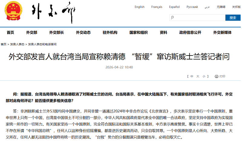 问:据报道,台湾当局领导人赖清德取消了对斯威士兰的访问。台当局表示,在中国大陆施压下,有关国家临时取消相关飞行许可。外交部对此有何评论?能否提供更多相关信息?