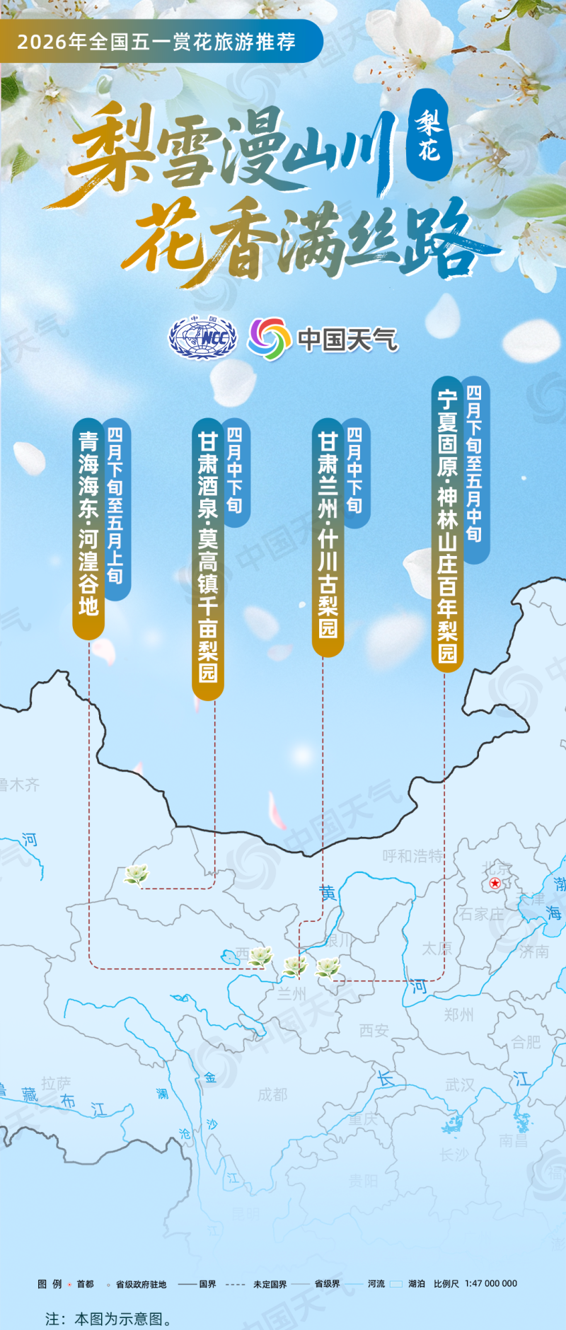 梨花:“梨雪漫山川・花香满丝路”(甘肃兰州什川古梨园、甘肃酒泉莫高镇千亩梨园、青海海东河湟谷地、宁夏固原神林山庄百年梨园);