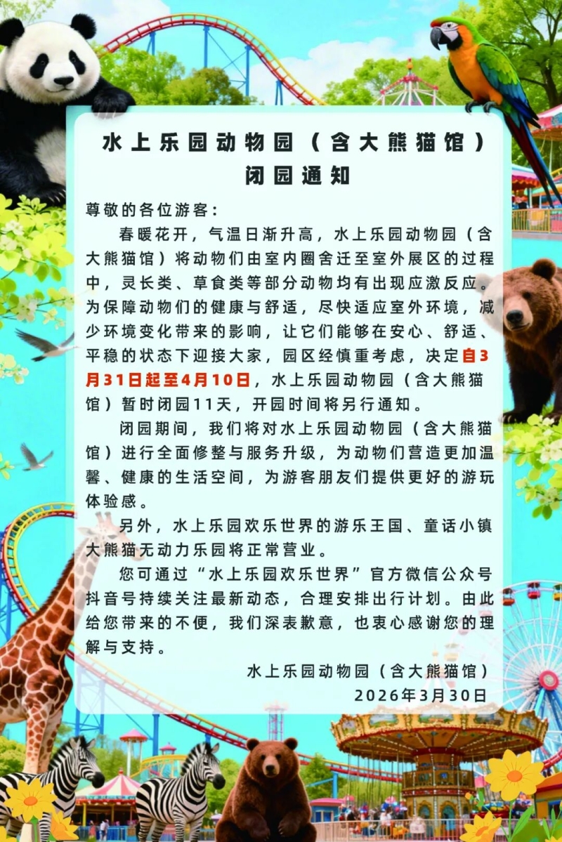 通知中称,气温日渐升高,水上乐园动物园(含大熊猫馆)将动物们由室内圈舍迁至室外展区过程中,部分动物出现应激反应。为保障动物们的健康与舒适,尽快适应室外环境,减少环境变化带来的影响,让它们在安心、舒适、平稳的状态下迎接大家,园区经过慎重考虑,决定暂时闭园11天。